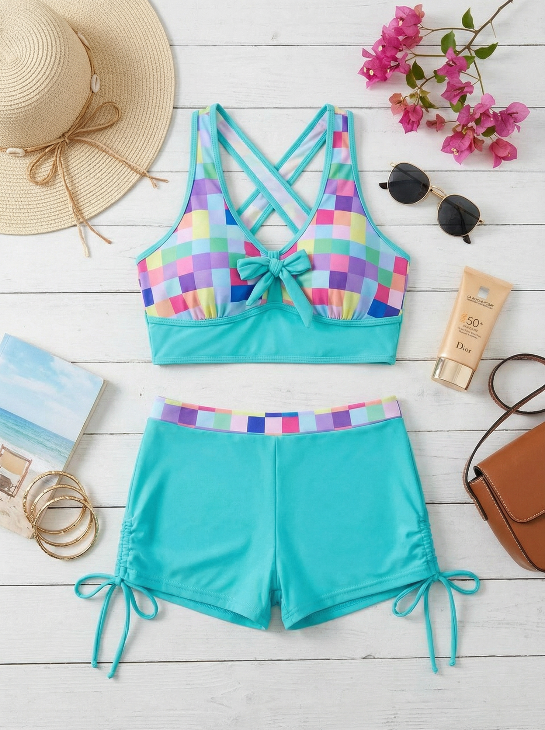 Спортен танкини сет в тюркоаз с весели цветни квадратчета в горната част. Горнището тип спортен бюст се кръстосва на гърба, има декоративна панделка отпред и меки подплънки за комфорт и стабилна поддръжка при движение. Долната част са къси шорти с връзки отстрани, които позволяват да регулираш дължината – идеален избор за плуване, плажни игри и активна лятна почивка.