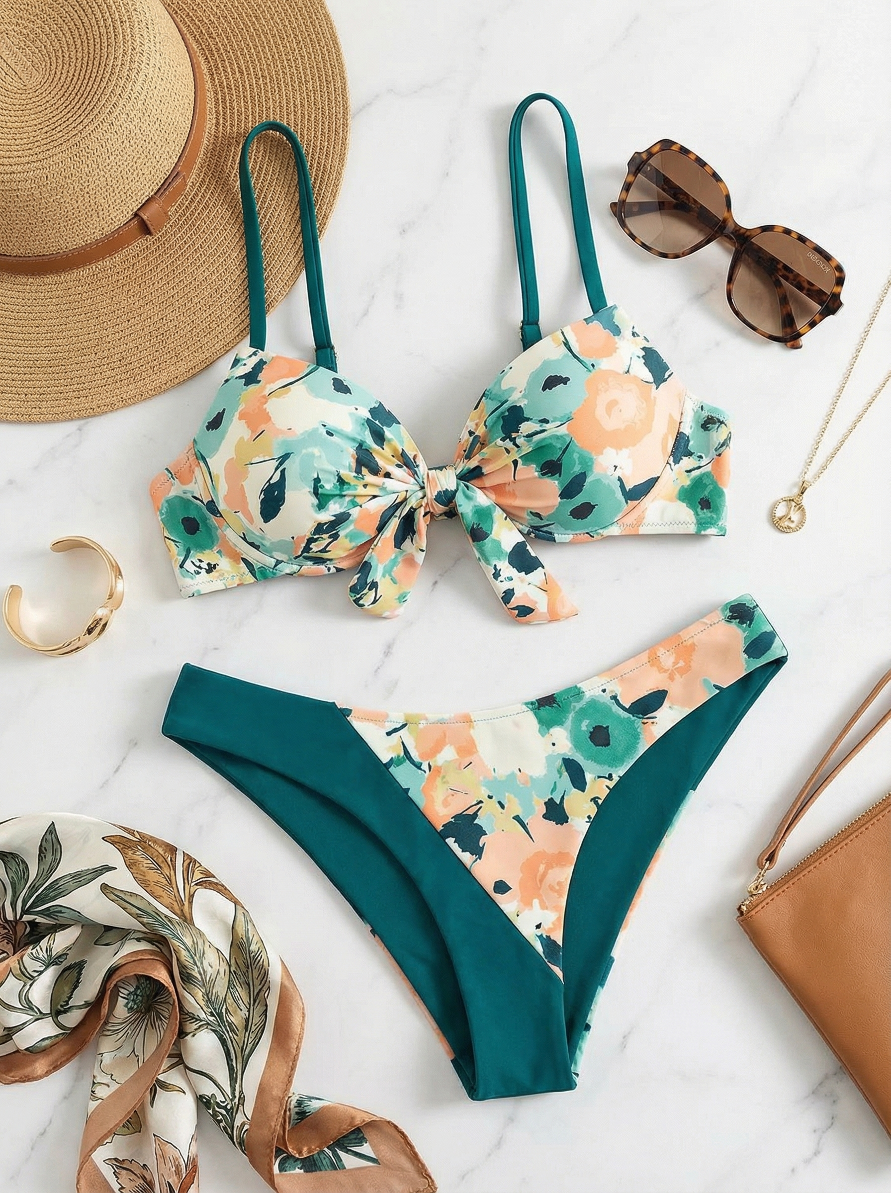 Стилен бански от две части с горнище в акварелен флорален принт в мента, праскова и крем, с кокетна връзка отпред и тъмно зелени презрамки. Горнището е с подплънки за добра форма и поддръжка, а долнището с диагонални зелени панели и принт оптически издължава краката и подчертава силуета – перфектен избор за свежа, женствена визия на плажа.