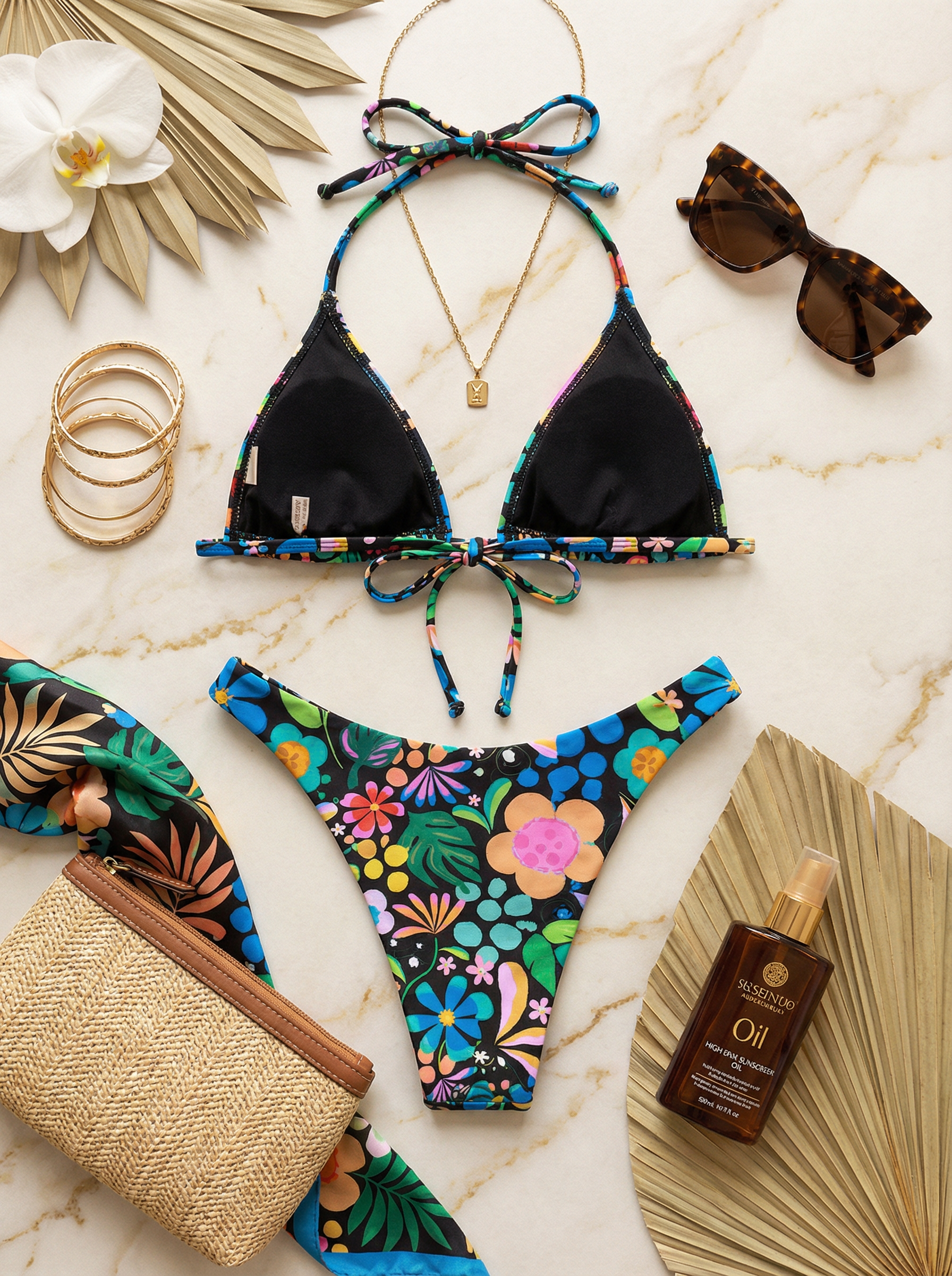 Ярък бански от две части с триъгълно горнище и долнище с по-висока изрязана линия, изработен от черна основа с цветен флорален принт в свежи тонове. Горнището е с меки подплънки, които оформят бюста и осигуряват комфорт, а тънките връзки позволяват лесно регулиране и перфектно прилягане. Веселите цветове подчертават тена и създават истинско лятно, бохо настроение на плажа.