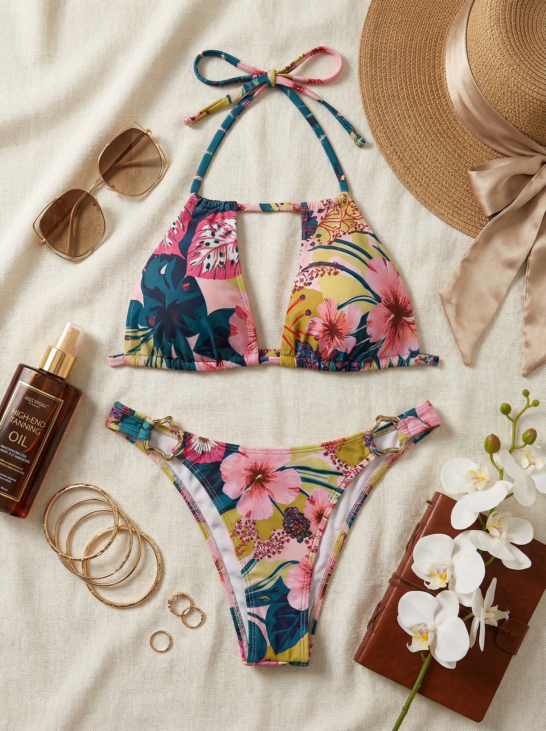 Тропически бански от две части с цветен флорален принт в розово, жълто и тюркоаз. Горнището тип халтер с декоративен отвор отпред и връзка зад врата е с меки подплънки за комфорт и лека поддръжка, а долнището с висока изрязана линия и метални халки отстрани подчертава краката и придава модерна, секси визия на плажа.