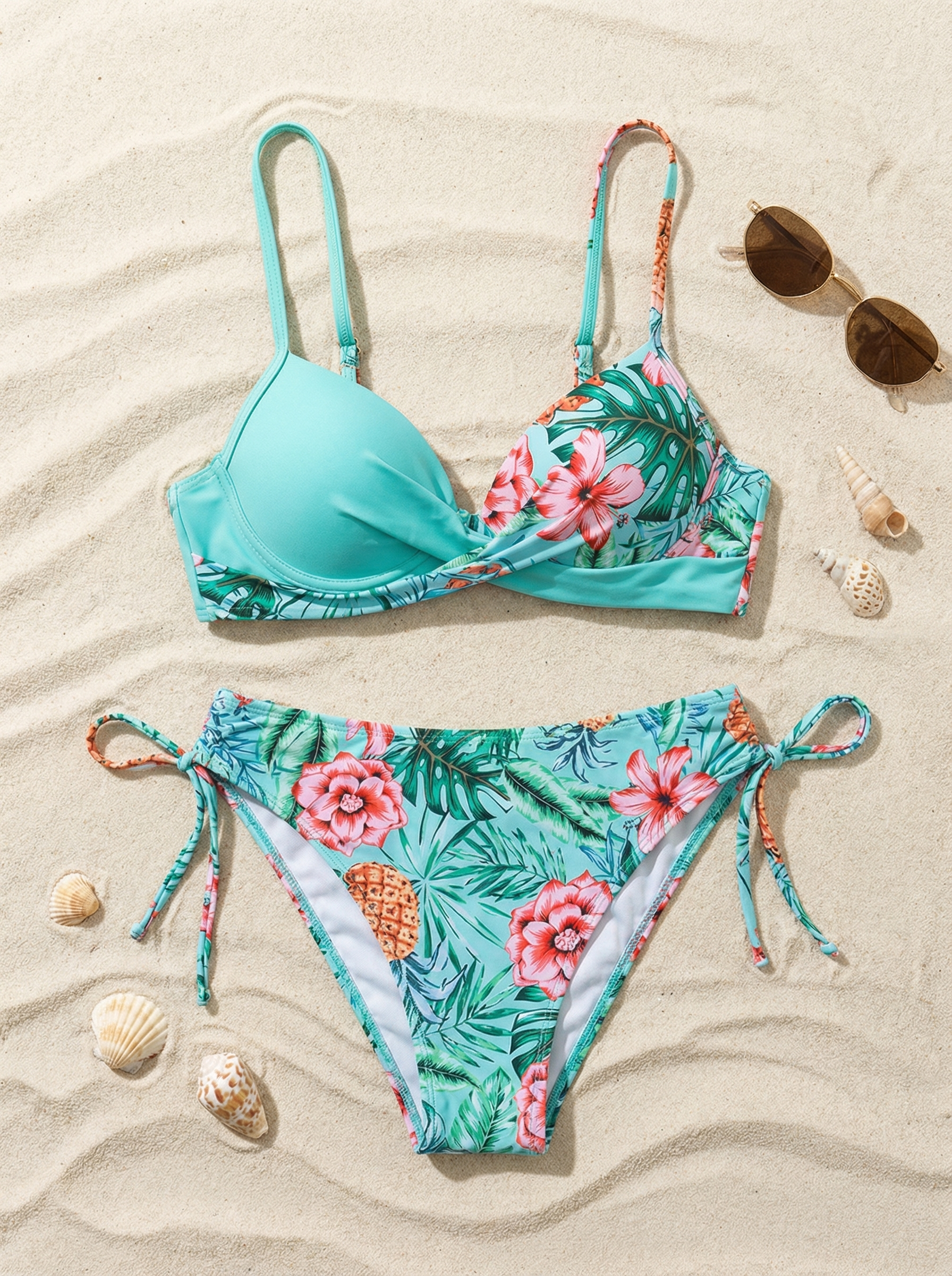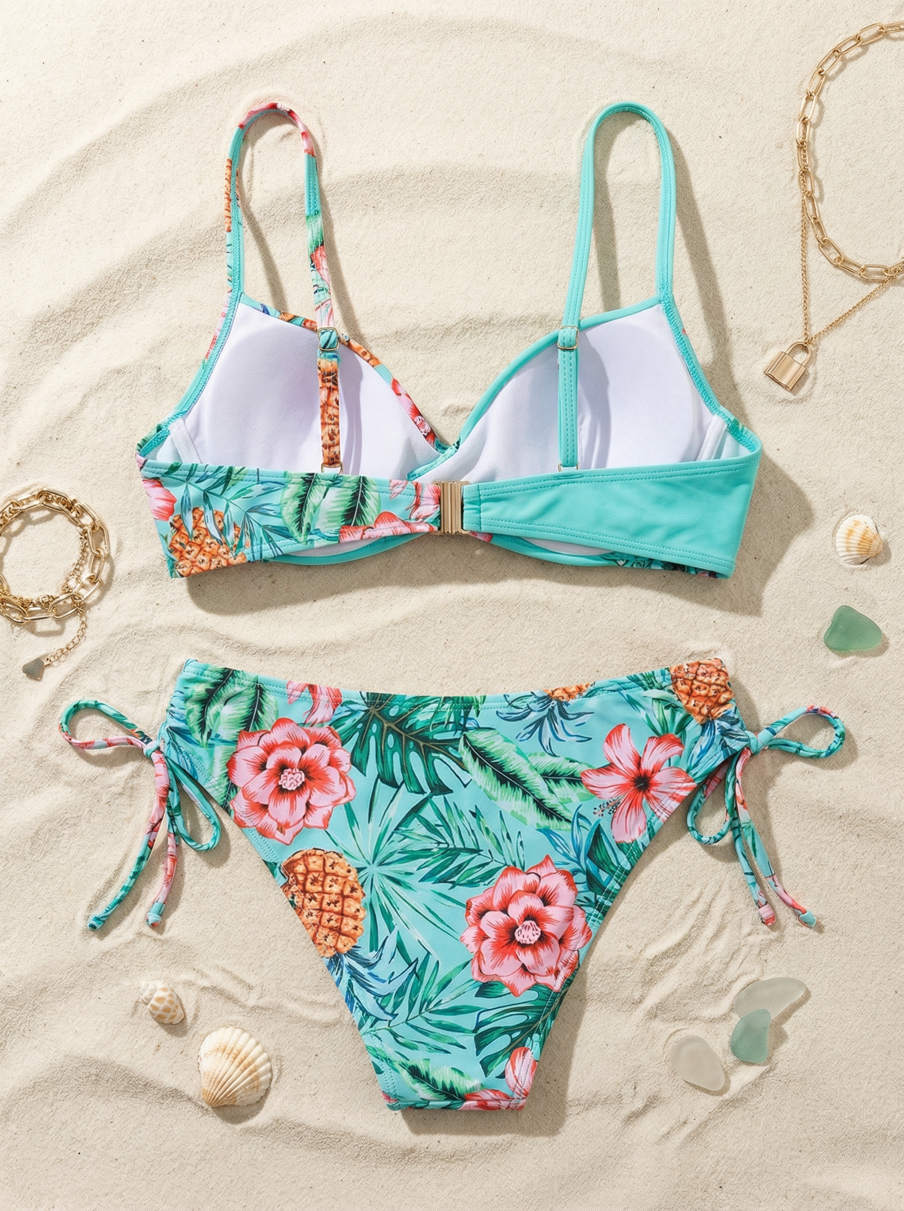 Тропически бански от две части в свеж тюркоаз с флорален принт и ананаси. Горнището с кръстосан ефект отпред и подплънки осигурява добра поддръжка, а долнището с връзки отстрани позволява регулиране и подчертава краката – идеален за цветна лятна визия на плажа.