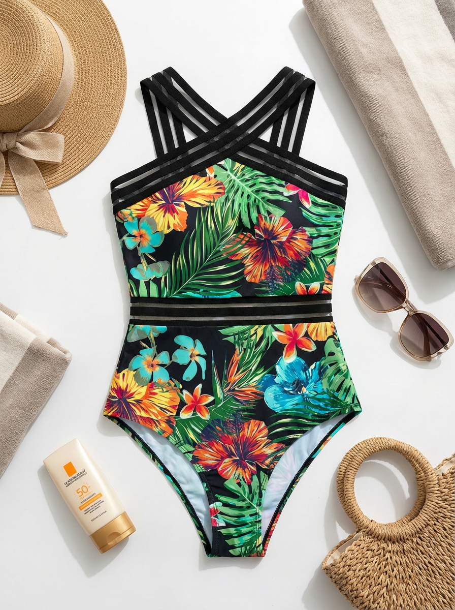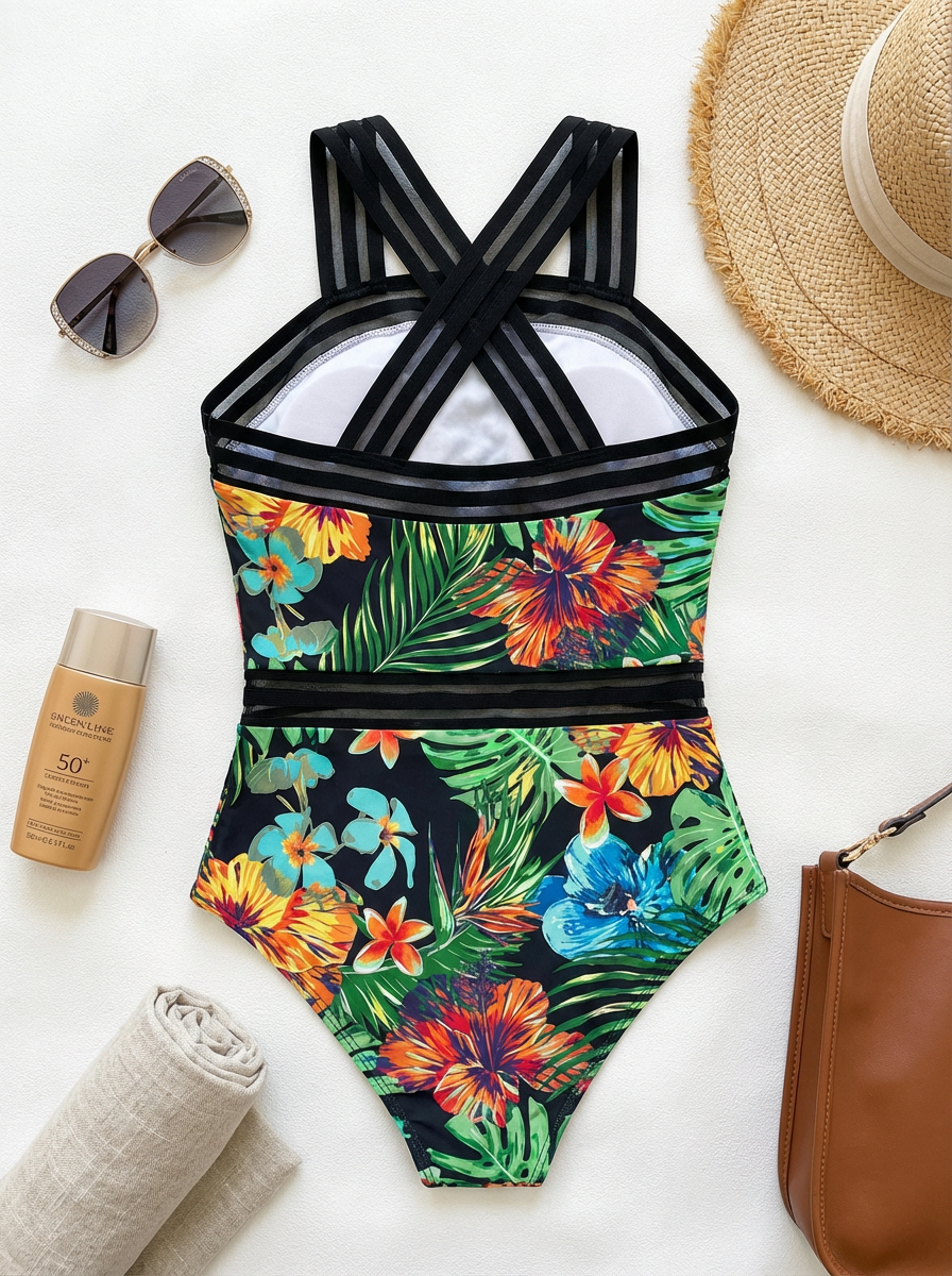 Шарен цял бански с ефектен тропически принт и широки декоративни ленти. Кръстосаните презрамки осигуряват стабилна поддръжка и комфорт при движение.