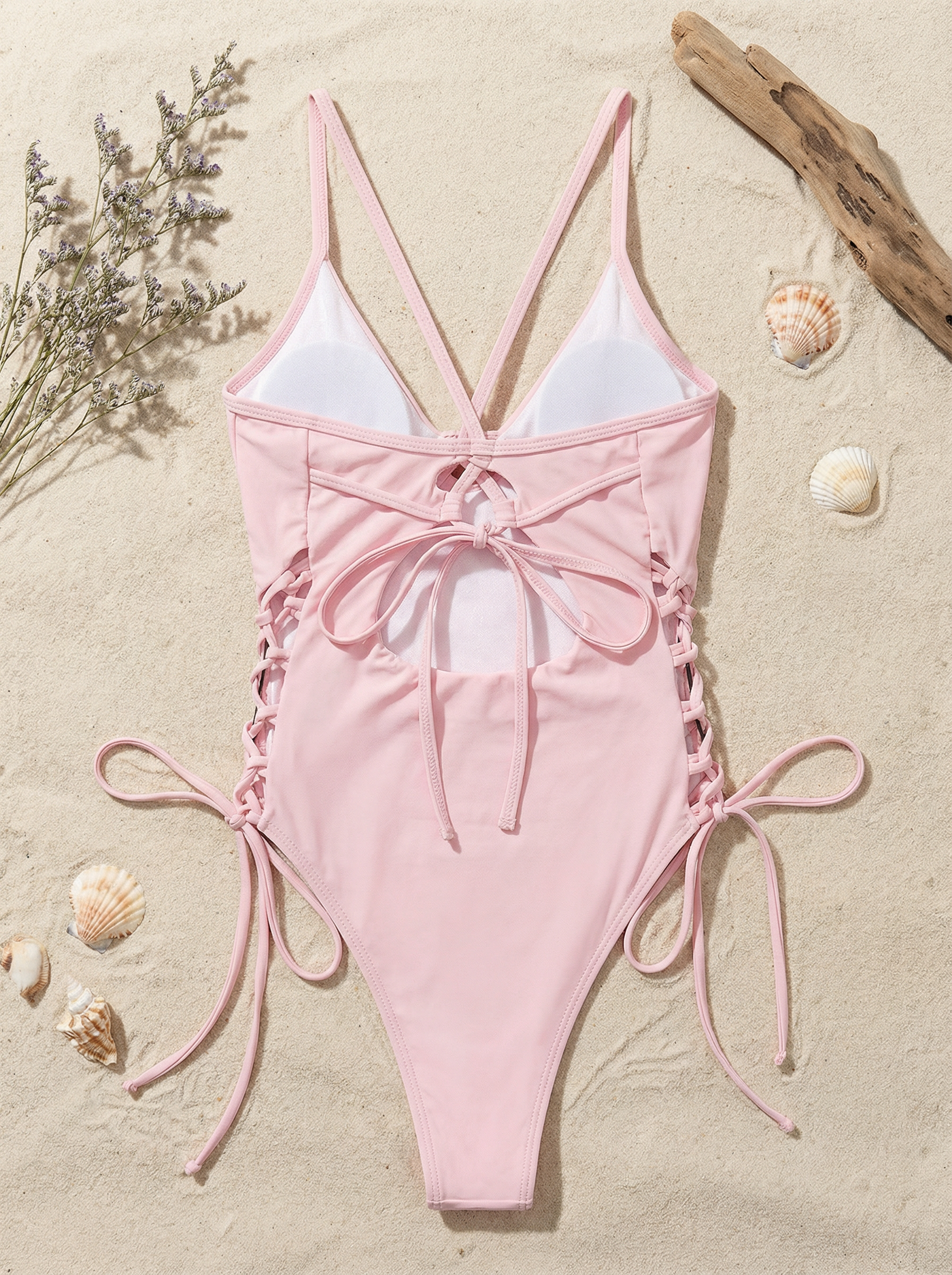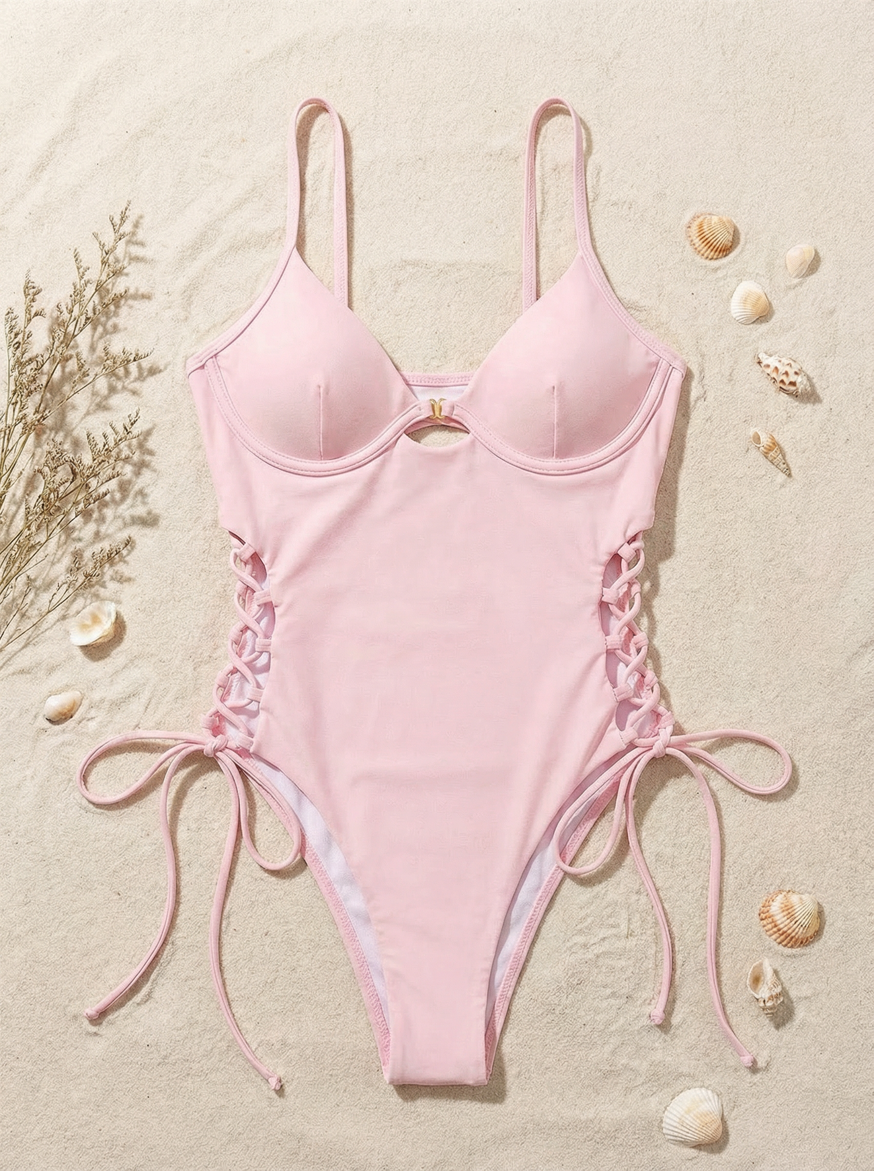 Нежен цял бански в светло розово с изчистена, но много женствена кройка. Горнището е с формовани чашки и подплънки за красиво оформен бюст и комфорт, а декоративната малка халка отпред добавя фин акцент. Страничните връзки тип корсет позволяват регулиране според фигурата и създават секси силует – идеален избор за романтична визия на плажа.