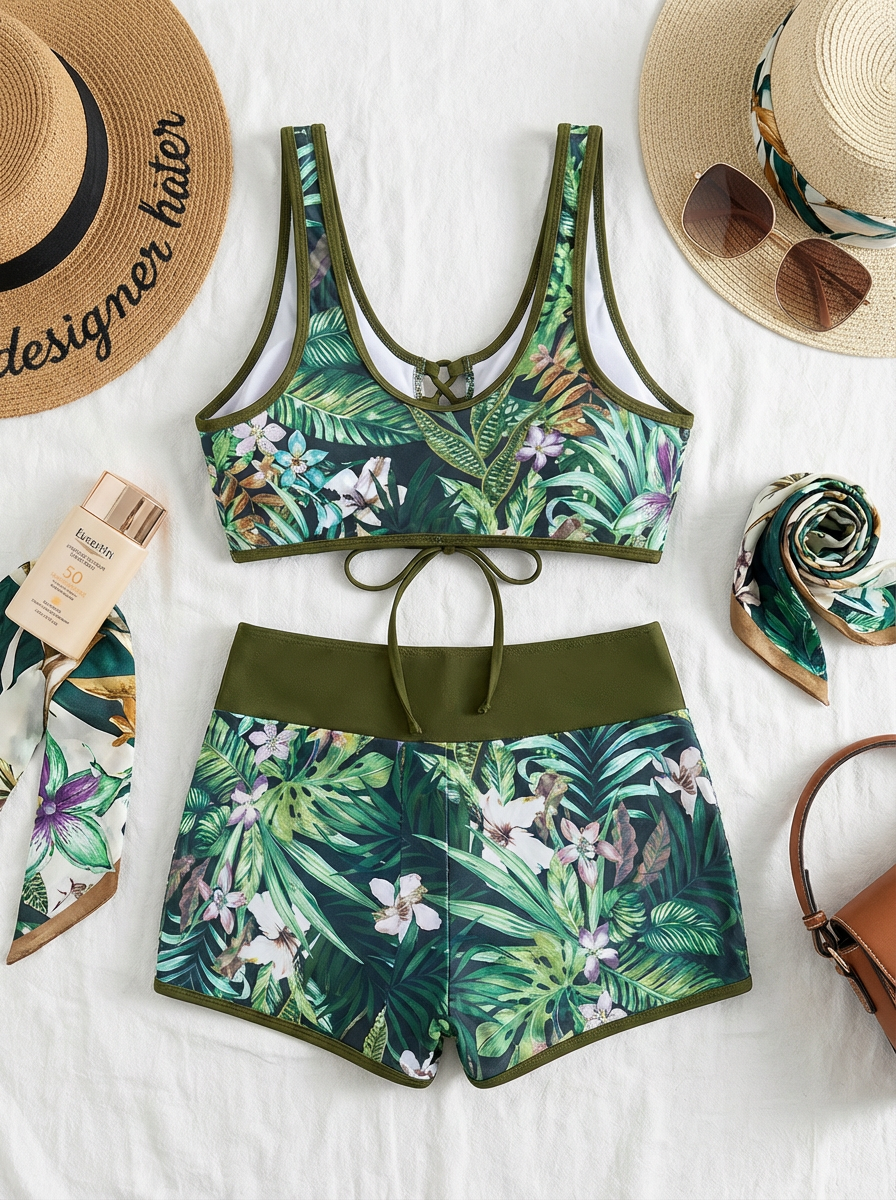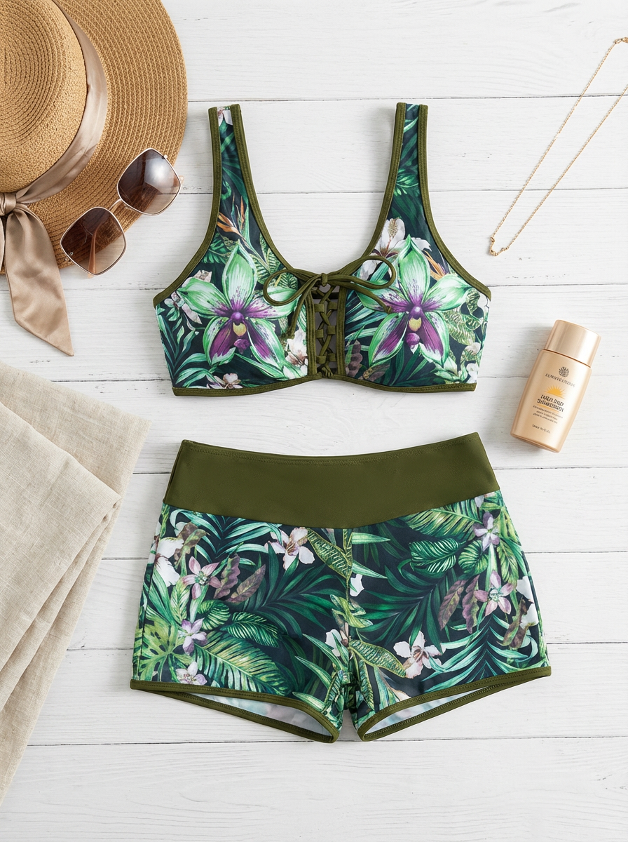 Двукамерен спортен бански с къси панталонки и горна част тип бюстие с връзки отпред, в маслено зелено с тропически флорален принт. Осигурява отлично покритие и комфорт за активно плуване, сърф и плажни игри.