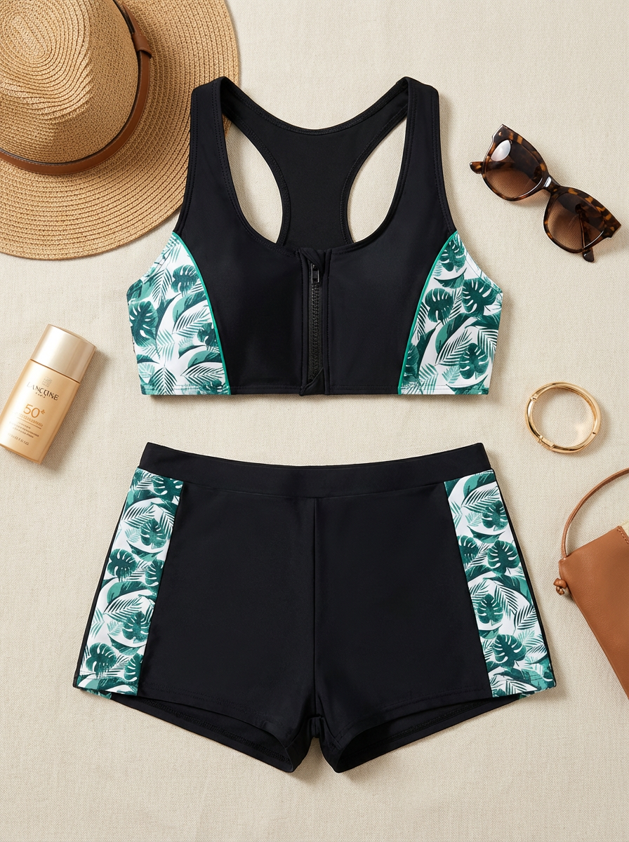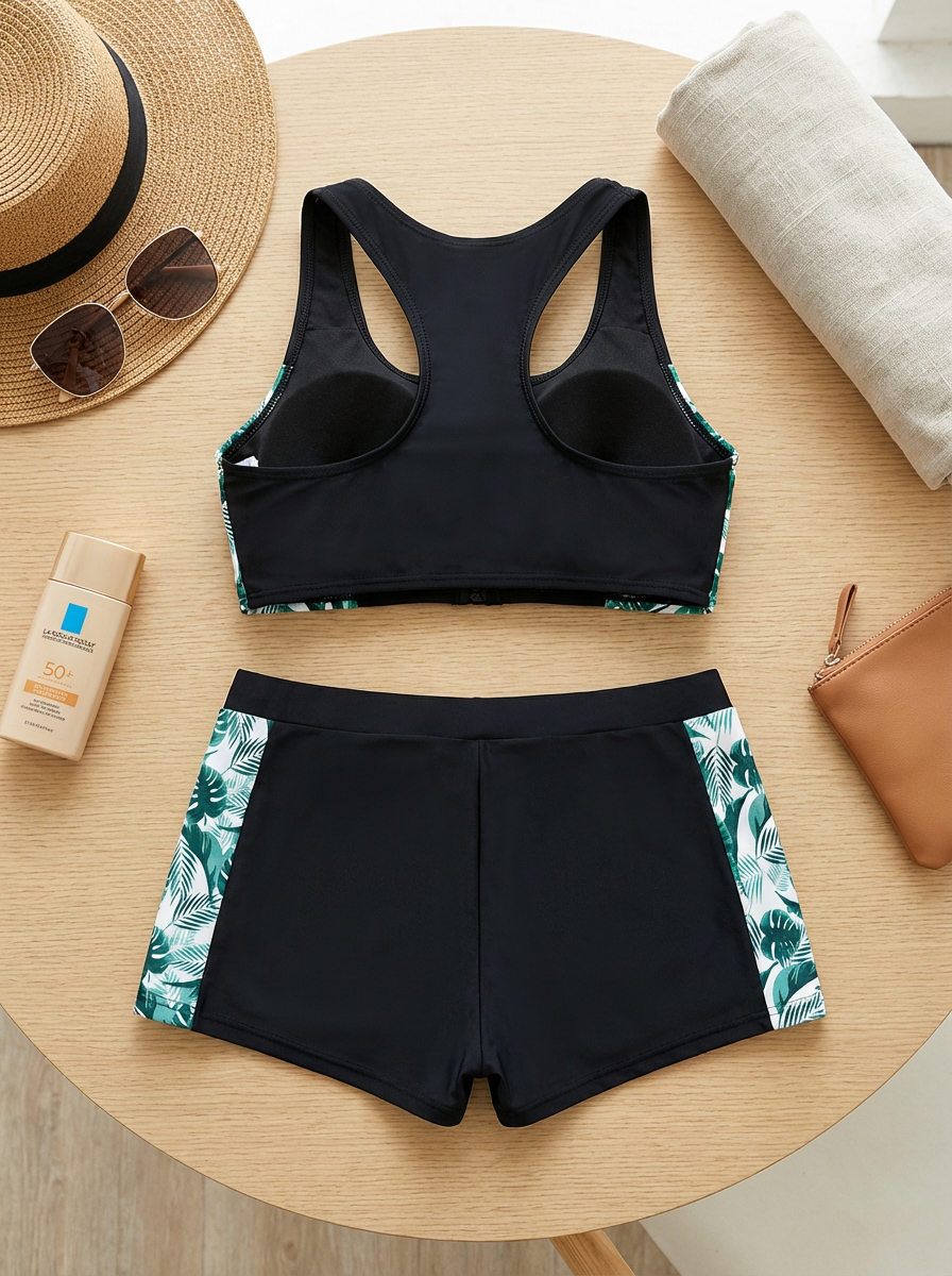 Спортен дамски бански от две части – черен топ тип спортен сутиен с цип отпред и ракла кройка на гърба, комбиниран с къси шорти. Отстрани има свежи панели с тропически листа в зелено, които издължават силуета. Идеален за плуване, аква аеробика и активен плаж.