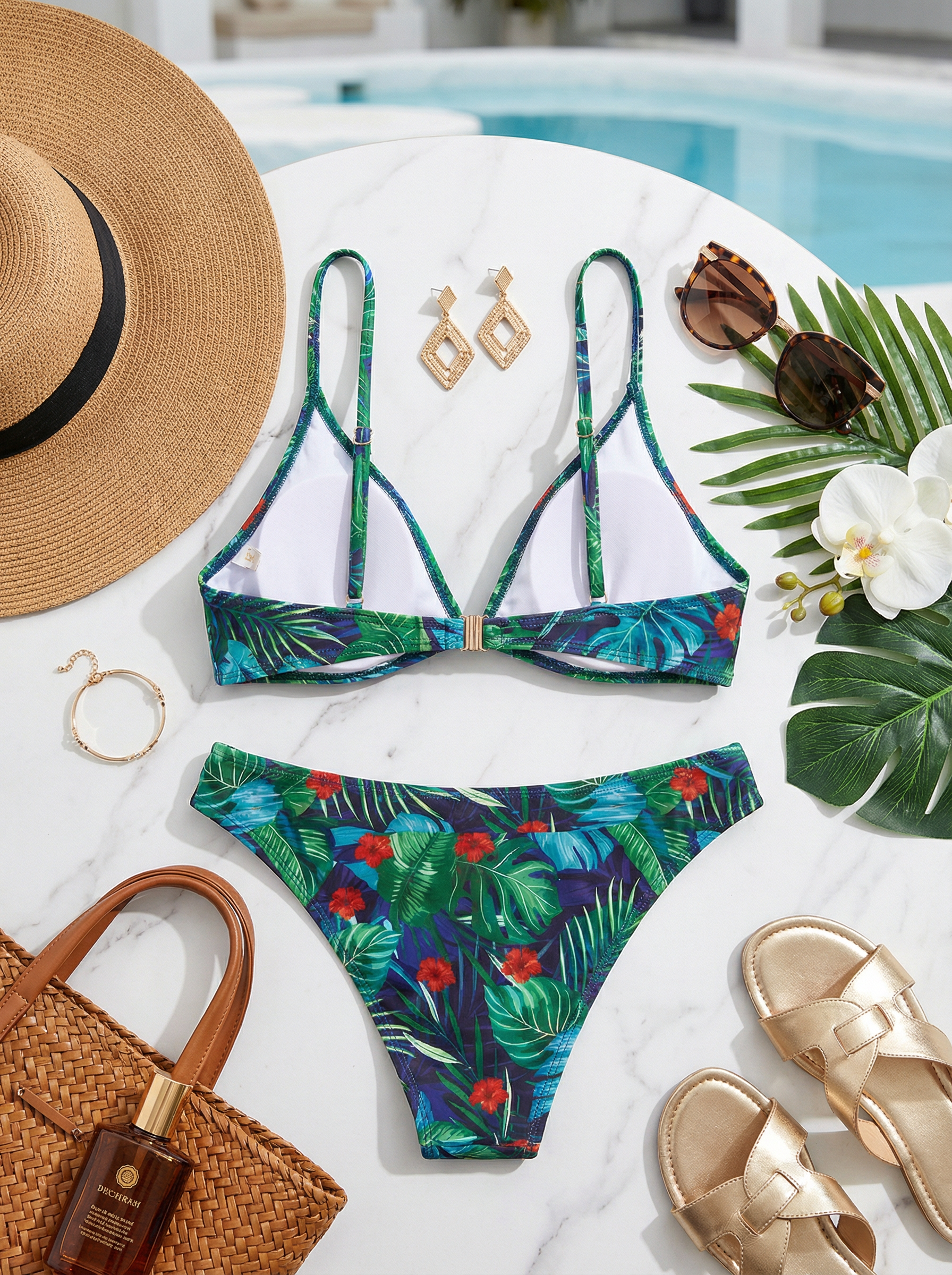 Тропически бански от две части с изчистена спортна кройка и ярък принт с палмови листа и червени цветя в зелено-сини нюанси. Горнището с тънки регулируеми презрамки и меки подплънки осигурява комфорт и стабилна поддръжка, а класическото долнище подчертава краката и придава модерна, свежа визия на плажа или басейна.