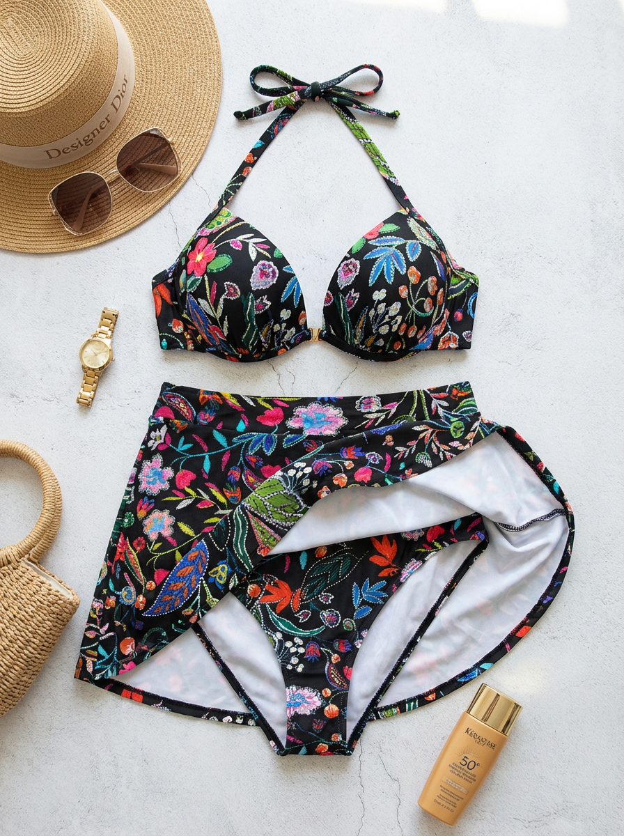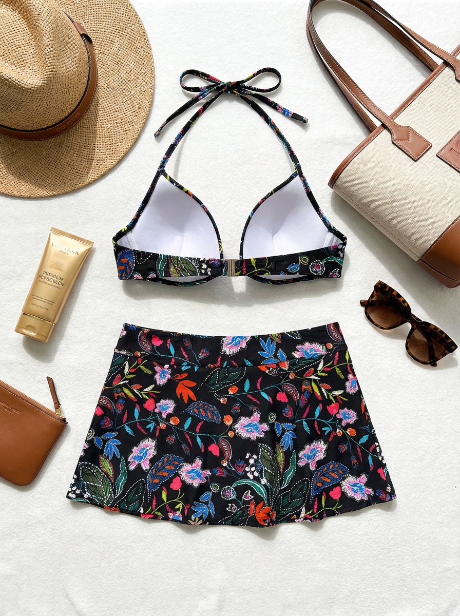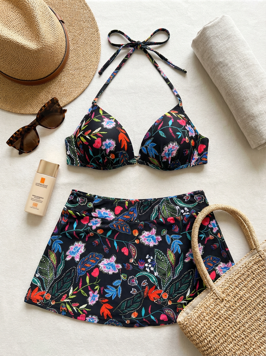 Елегантен бански две части с черна основа и цветен флорален принт, който подчертава тена и придава луксозно излъчване. Горнището е с меки подплънки и оформящи чашки тип push-up, връзва се на врата за стабилна поддръжка и красиво повдигане на бюста. Долната част е с висока талия и вградено долнище под ефектна пола, която деликатно прикрива коремчето и ханша. Меката, еластична и бързосъхнеща материя осигурява комфорт през целия ден на плажа или басейна.