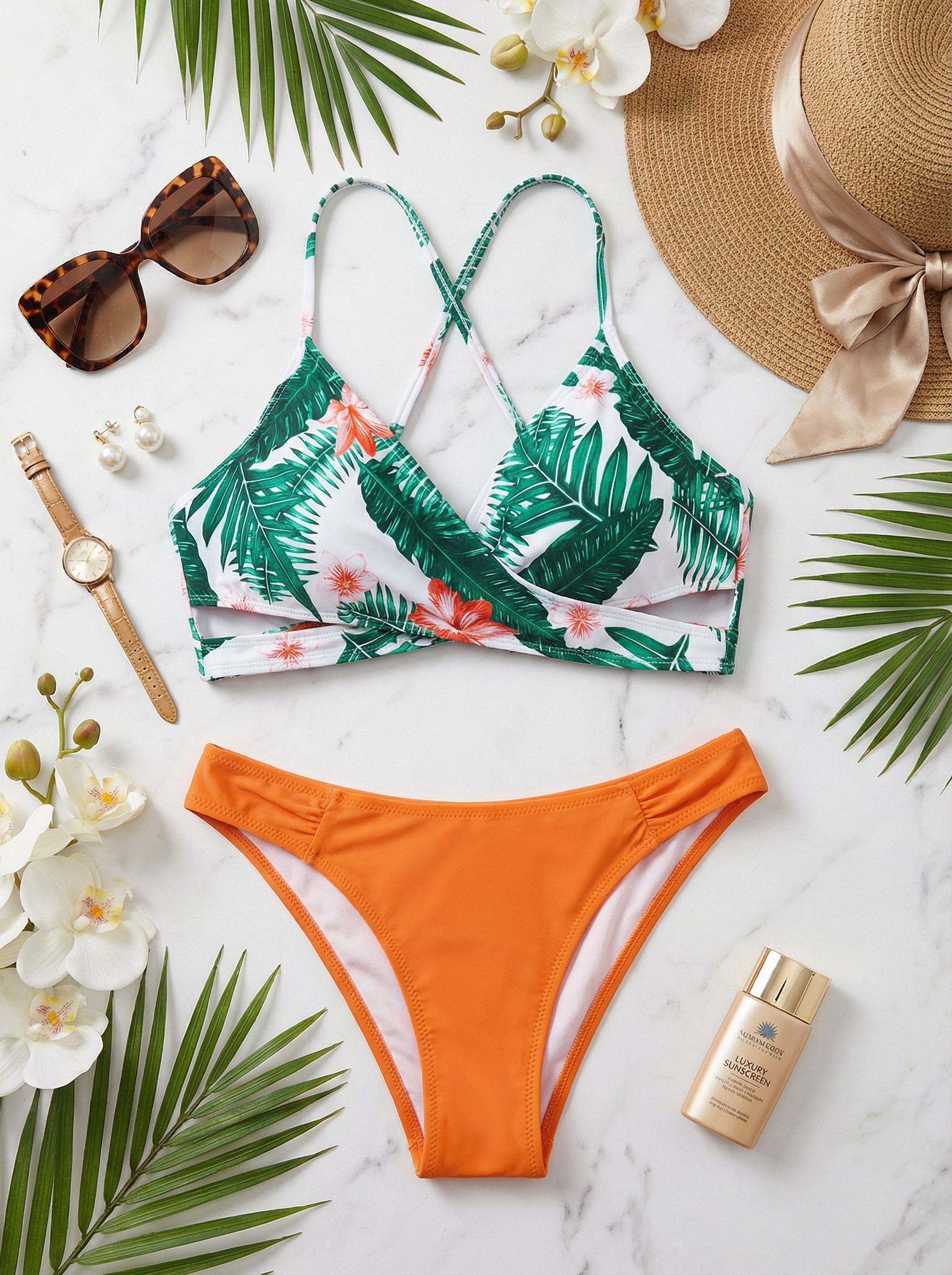Тропически сет от две части със свеж горнище с листа и цветя в зелено и коралово върху бяла основа и изчистено оранжево долнище. Кройката на горнището с кръстосан ефект отпред и тънки презрамки осигурява стабилност и поддръжка, а яркият цвят на долната част подчертава тена и създава модерна, лятна визия на плажа.