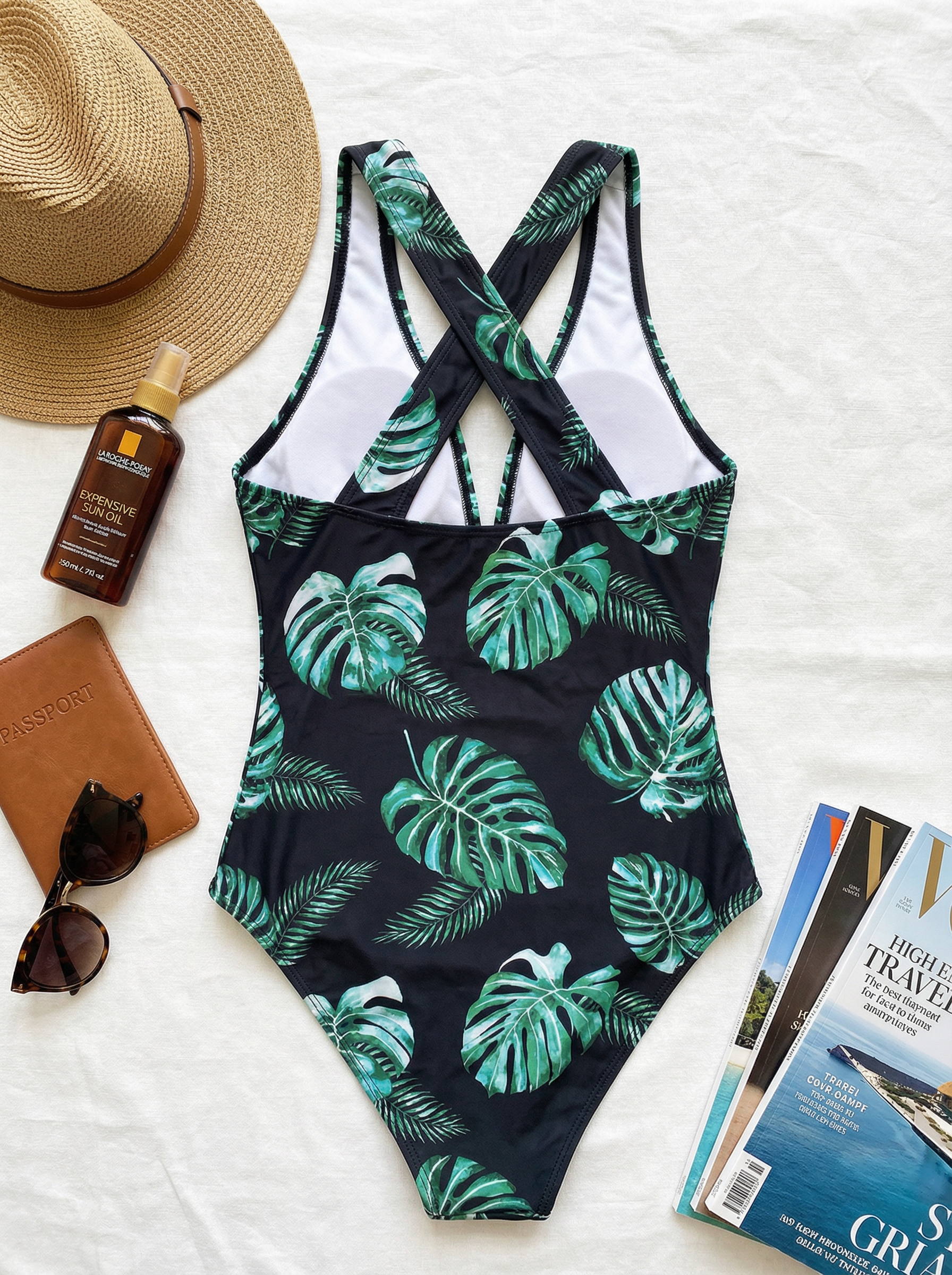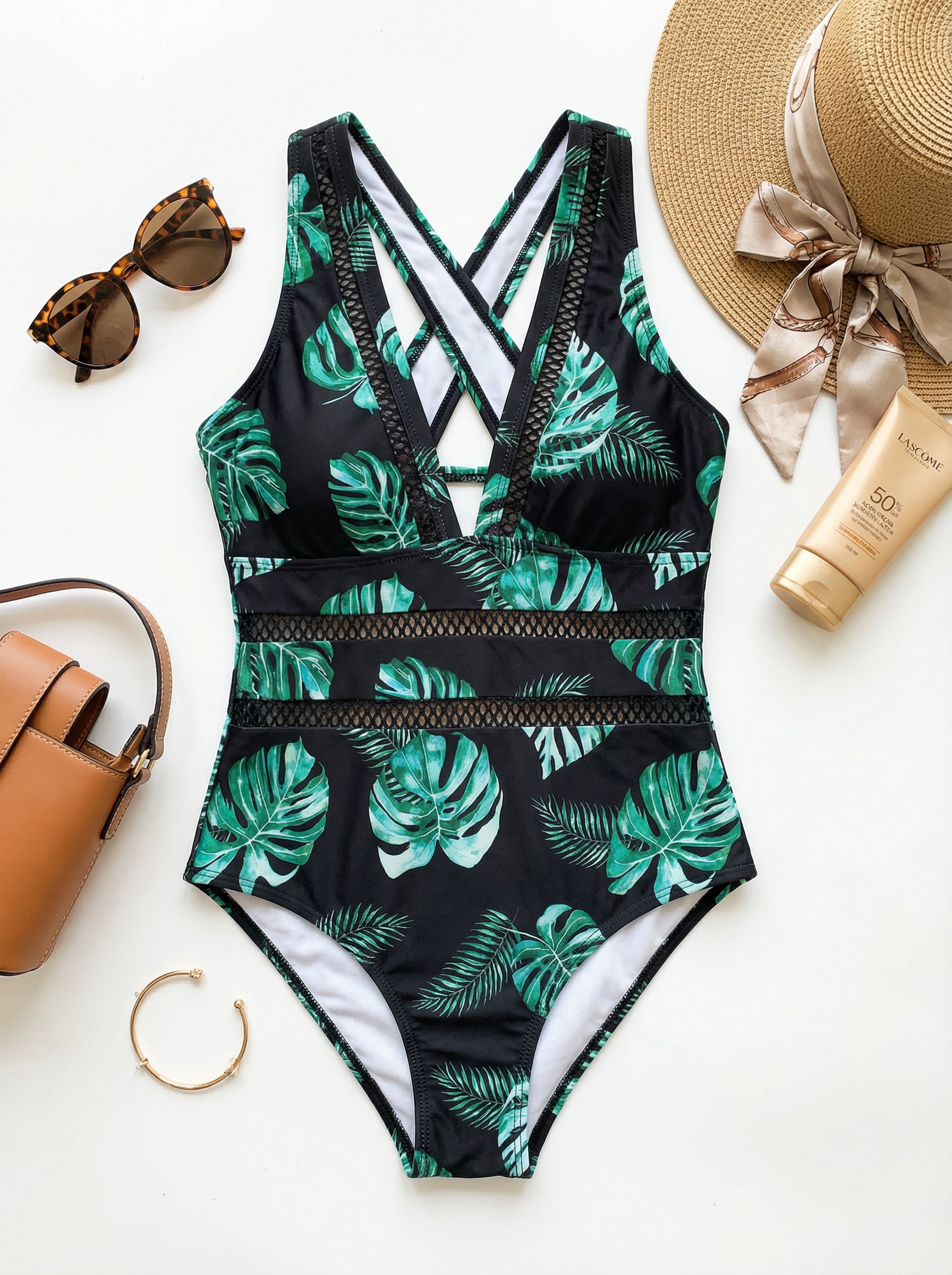 Стилен цял бански в черно с тропически принт от зелени листа монстера и палми. Дълбокото V-деколте с декоративни презрамки и мрежести ленти в талията оптически издължават силуета, а меките подплънки осигуряват комфорт и добра поддръжка на бюста. Идеален избор за модерна и уверена визия на плажа или басейна.