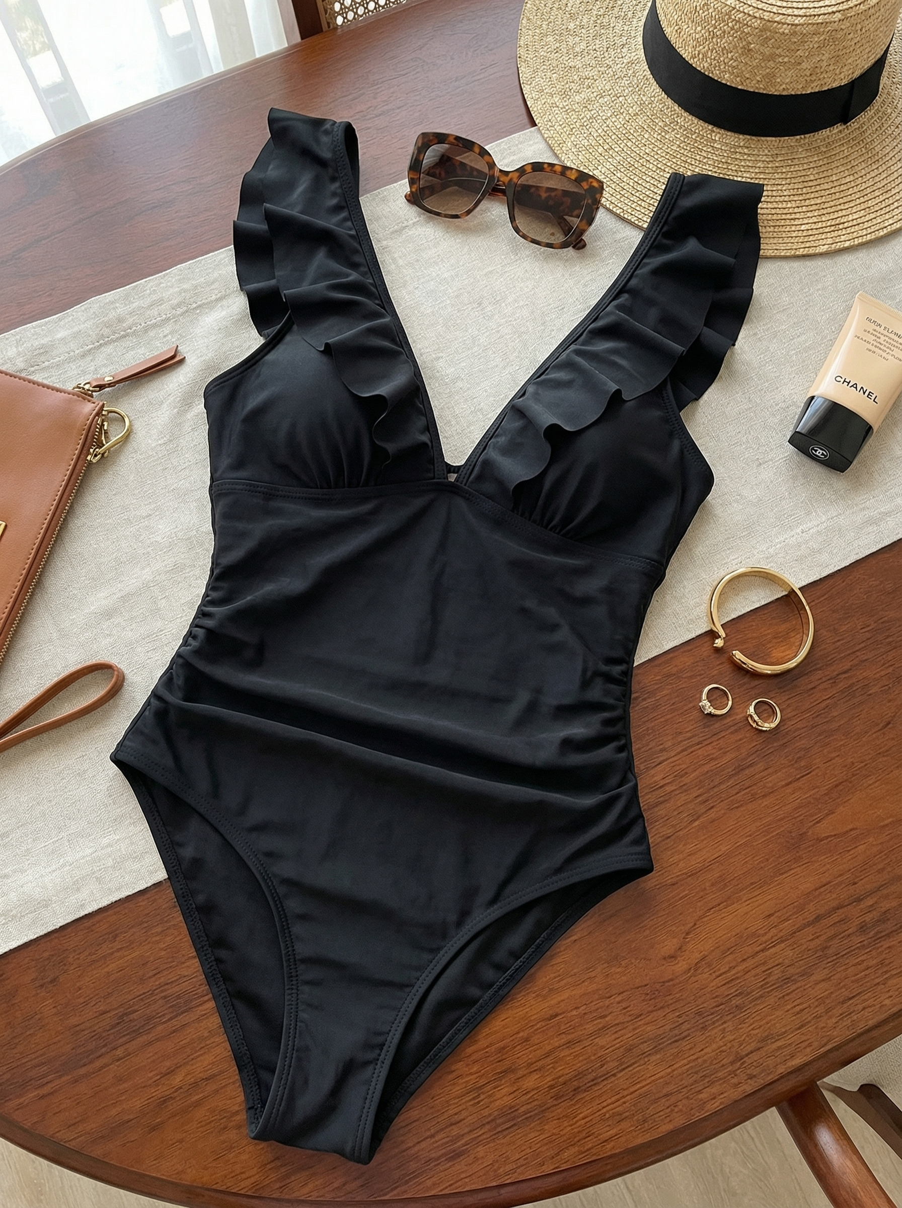 Елегантен цял черен бански с дълбоко V-деколте и романтични волани по презрамките. Меката стягаща материя оформя силуета, а изчистеният дизайн го прави идеален както за плаж, така и за стилен басейн или спа уикенд. Меки подплънки в горната част.