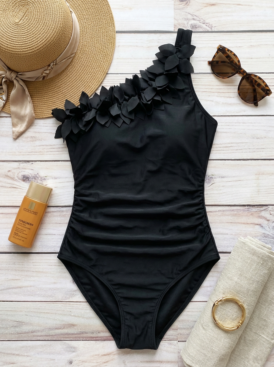 Елегантен цял бански в класическо черно с асиметрично рамо и красиви 3D волани около деколтето, които придават луксозна визия. Нежните набирания по коремчето оптически изглаждат силуета, а меките подплънки осигуряват комфорт и лека поддръжка на бюста. Идеален избор, ако търсиш изчистен, но ефектен модел за плажа или басейна.