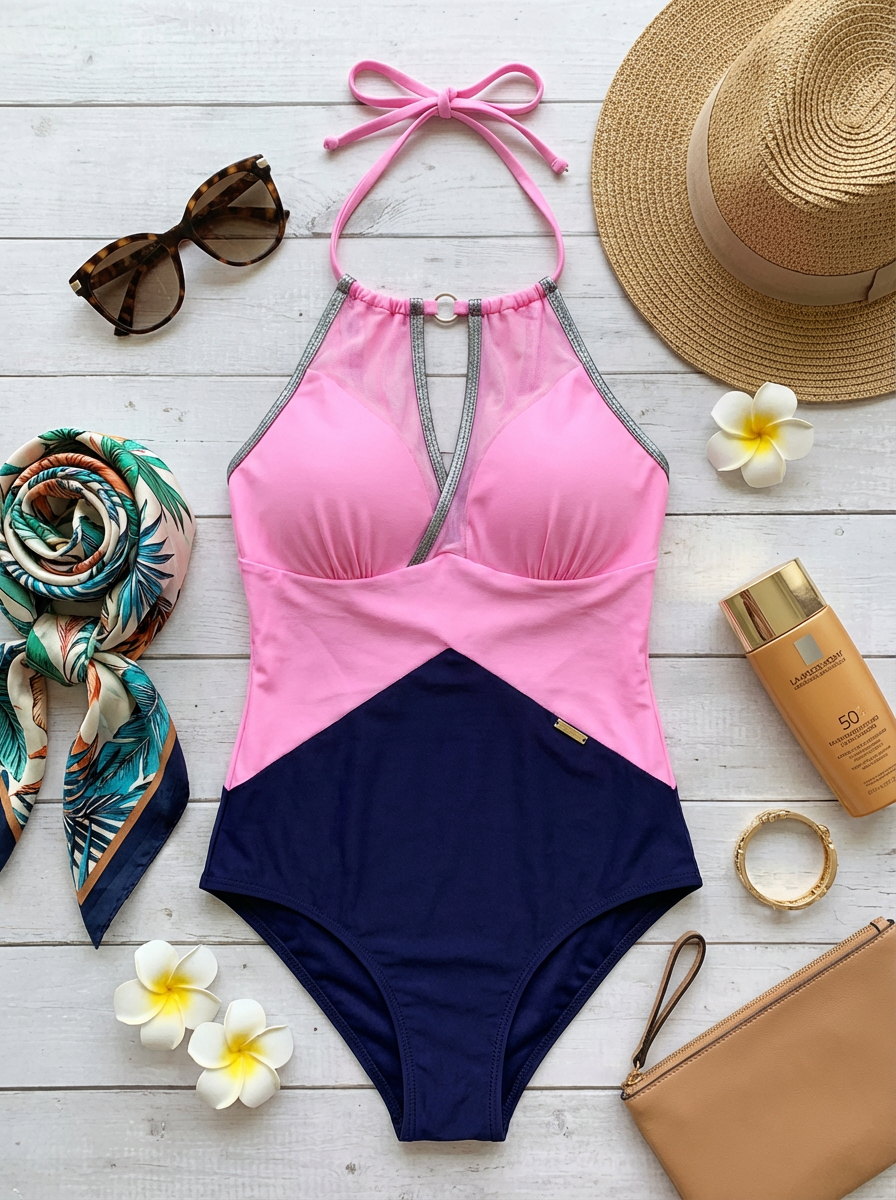 Едноцветен цял бански в шик комбинация от нежно розово и тъмно синьо, който красиво подчертава талията с V-образен колор блок ефект. Горната част е с ефектно мрежесто деколте и връзка зад врата за стабилна опора, а push up подплънки оформят и повдигат бюста. Изработен от еластична, бързосъхнеща материя, този модел е идеален както за плажа, така и за басейн, когато искаш едновременно комфорт и модерна визия.