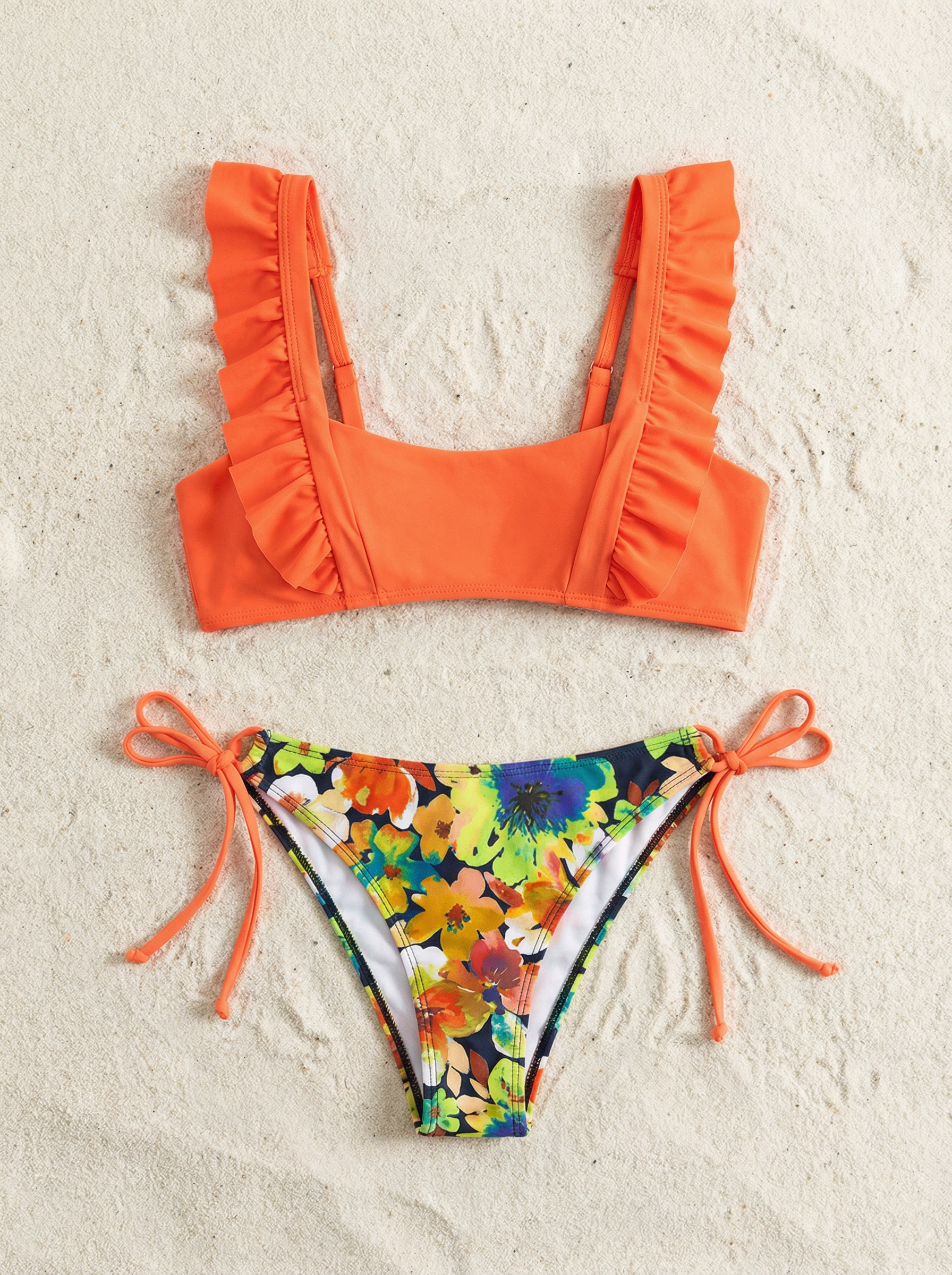 Ярък бански от две части с ефектно оранжево горнище и цветно флорално долнище. Горнището е с прав силует и романтични къдри по презрамките, както и подплънки за комфорт и лека поддръжка. Долнището с връзки отстрани позволява регулиране според фигурата и създава свежа, лятна визия на плажа.