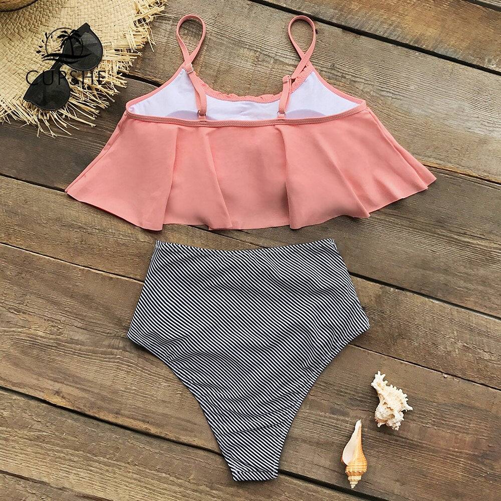 Розов флотиращ танкини комплект с висока талия и нежни райета. Свободният топ с леки къдри прикрива красиво бюста и горната част на тялото, а стягащото долнище с висока талия изглажда коремчето и подчертава талията. Идеален избор, ако търсиш едновременно удобство, прикриващ ефект и сладка, женствена визия на плажа или басейна.
