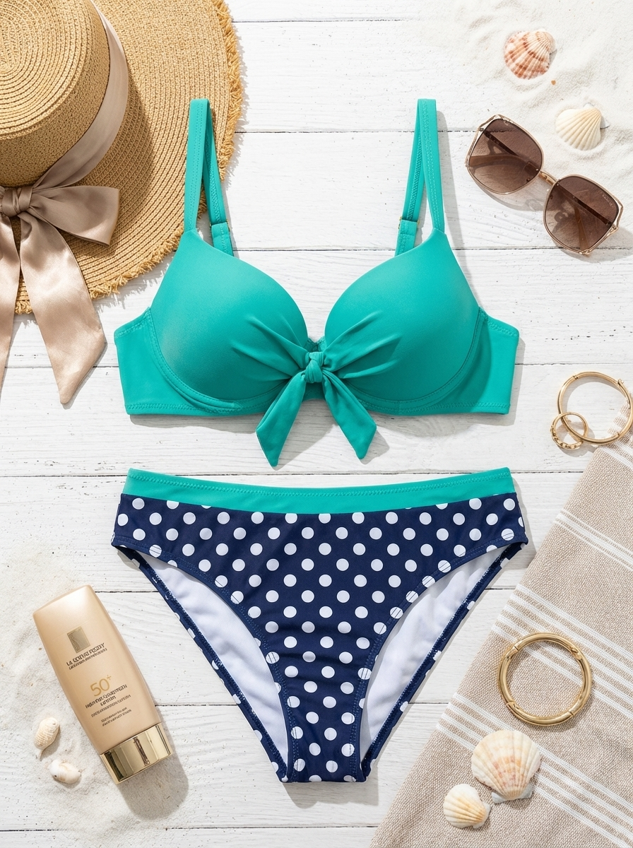 Освежаваща комбинация от тюркоаз и класически тъмносиньо с бели точки – комплект, който подчертава фигурата и стои много женствено и подредено. Комплект с push up ефект.