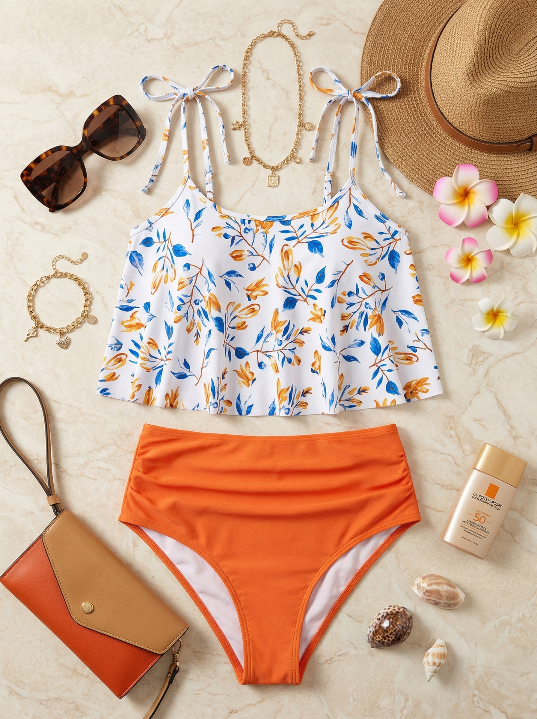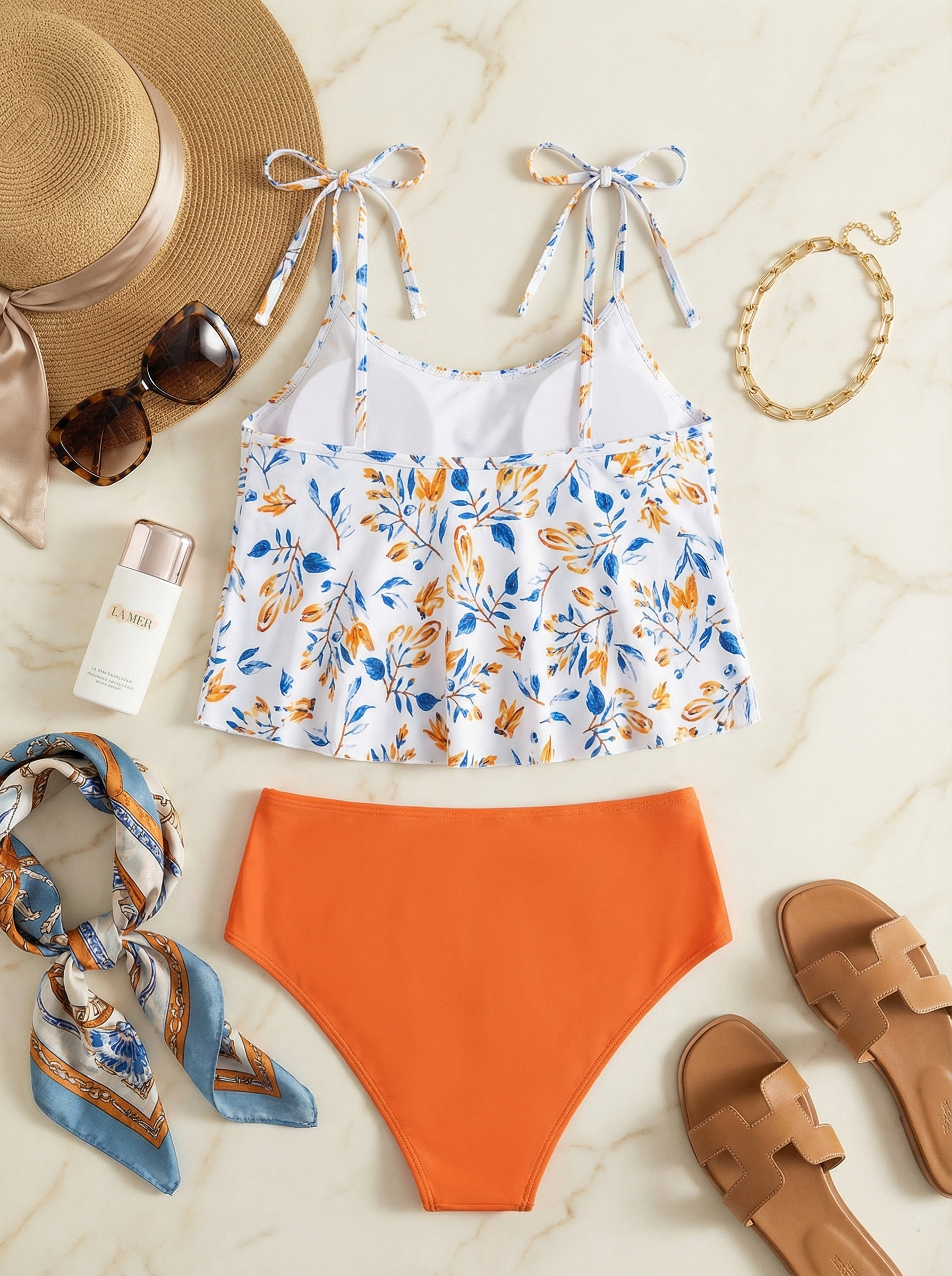 Романтичен танкини сет от две части с ефирно горнище тип топ в бяло с жълто-син флорален принт и връзки на раменете и изчистено оранжево долнище с висока талия. Широката, падаща кройка на горната част деликатно прикрива коремчето, а стягащото долнище оформя силуета и осигурява комфортна и уверена визия на плажа или басейна.