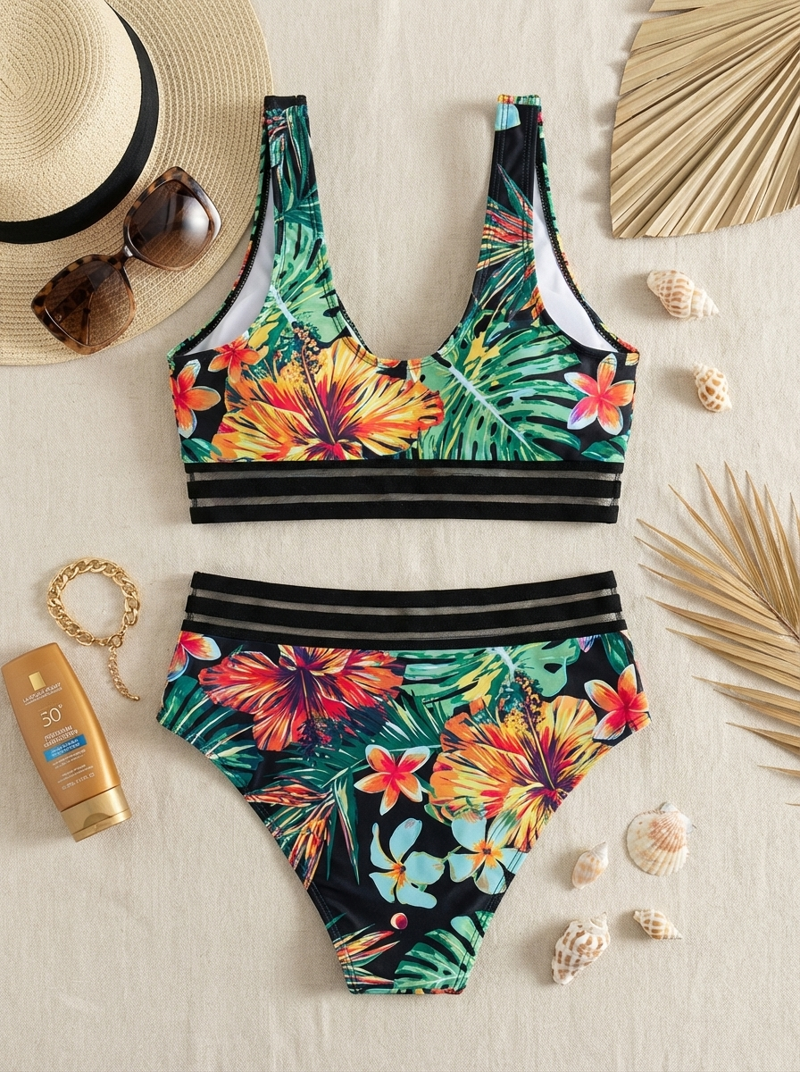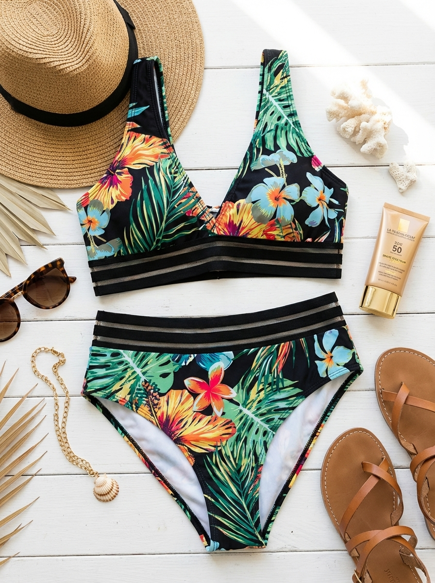 Тропически бански от две части с ярък флорален принт върху черна основа и контрастни спортни ленти в талията и под бюста. Високата бикина и стабилното горнище с подплънки осигуряват комфорт и красиво оформен силует за плажа и басейна.